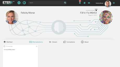 Chamado eterni.me, se descreve da seguinte forma: "coleto seus pensamentos, histórias e memórias, organizo tudo isso e crio um avatar inteligente que se parece com você".