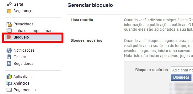 O Facebook possui uma página dedicada a bloqueios. De amigos a aplicativos, a rede social permite que os usuários restrinjam qualquer conteúdo exibido em seu perfil.